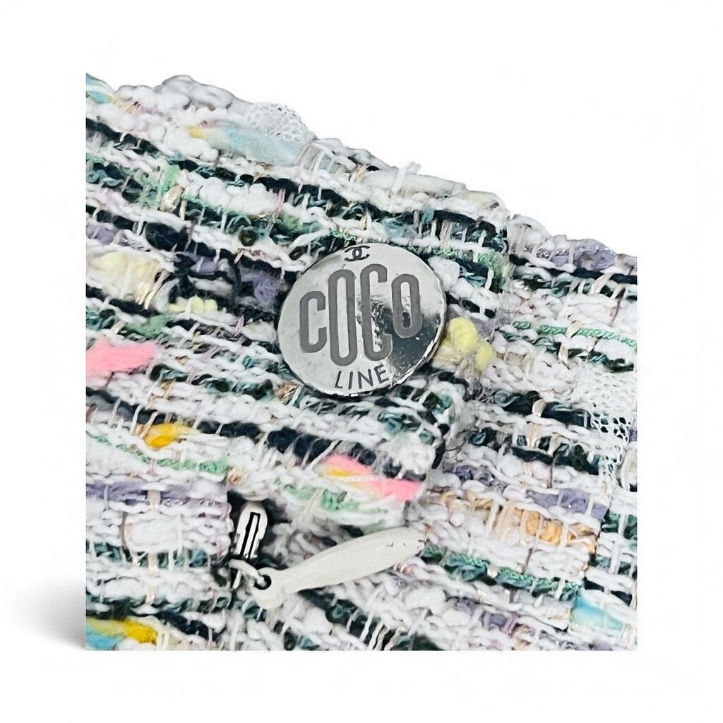 Fully lined in Chanel’s luxurious signature Camellia logo silk, the skirt is finished with a concealed zipper and a chic silver "Coco Line" button at the back—a subtle but iconic detail.
