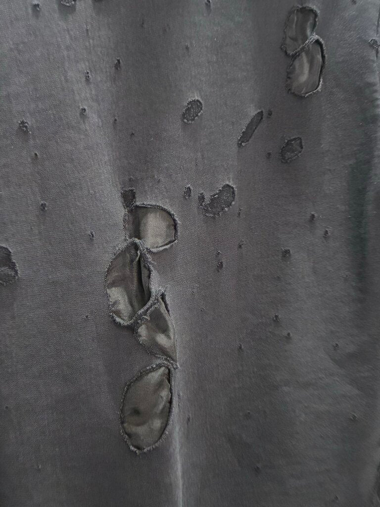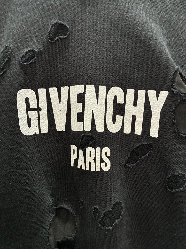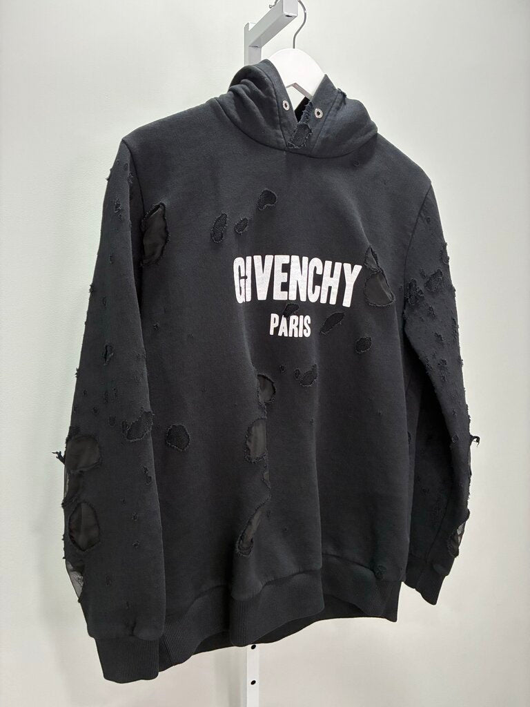 The front features a bold Givenchy logo print at the center chest, while the garment showcases intentional distressing throughout—each "hole" detail is backed with mesh lining, ensuring the look remains fashion-forward without compromising structure or coverage.