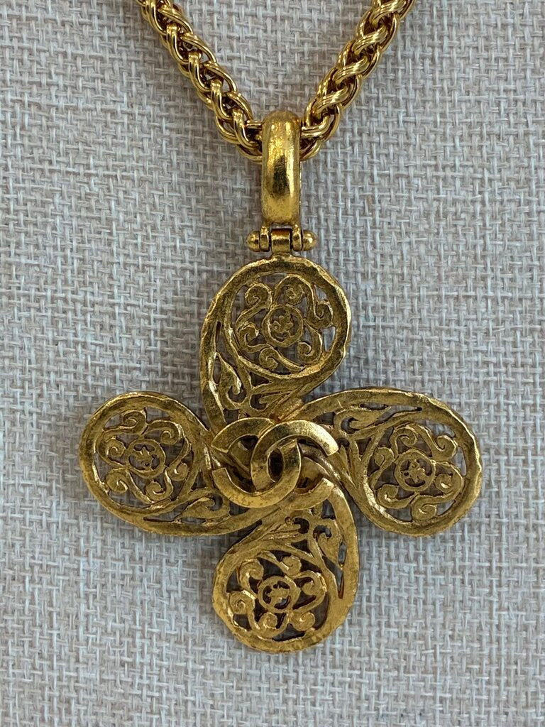 Crafted in gold-plated metal (not just gold-tone), this statement necklace features a 2-inch diameter quatrefoil-shaped pendant adorned with Chanel’s signature swirl motif, creating rich texture and visual depth. The pendant is suspended from a 29.5-inch chain, giving it a dramatic, elongating silhouette that's perfect for layering or wearing as a standalone piece.