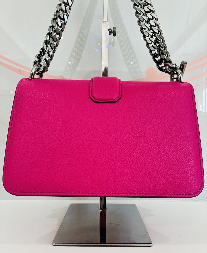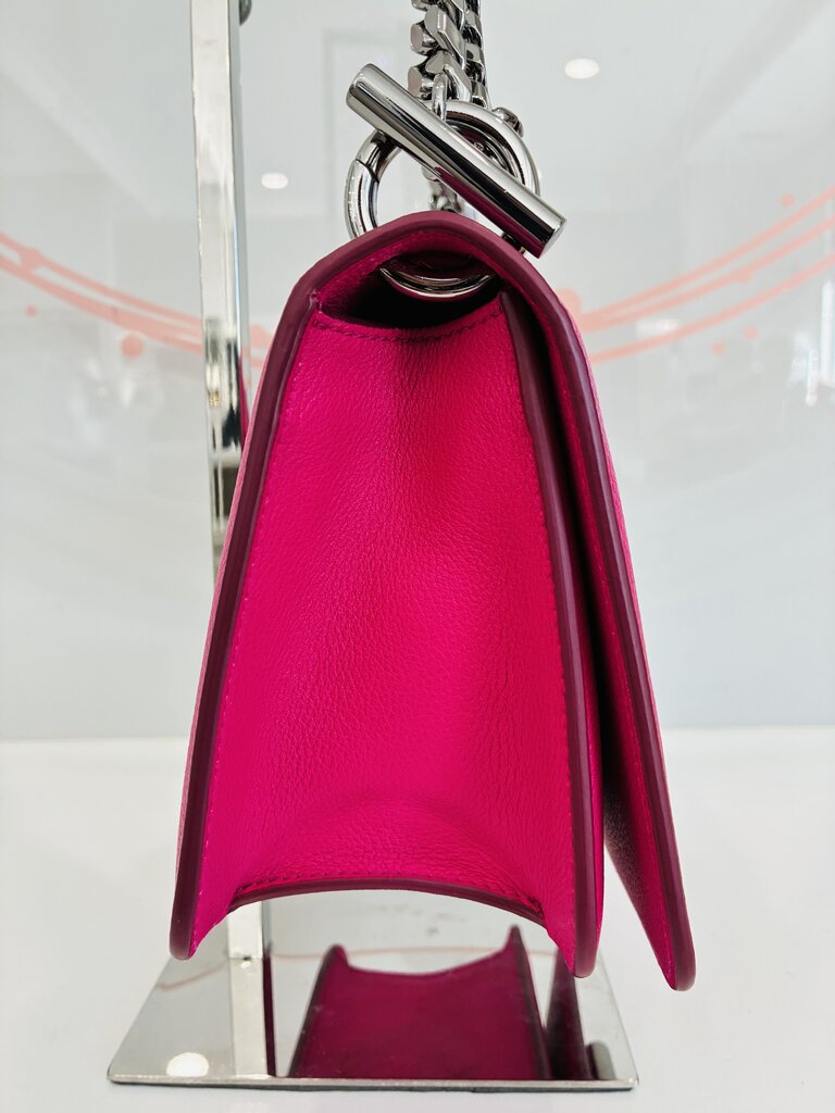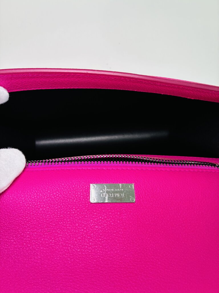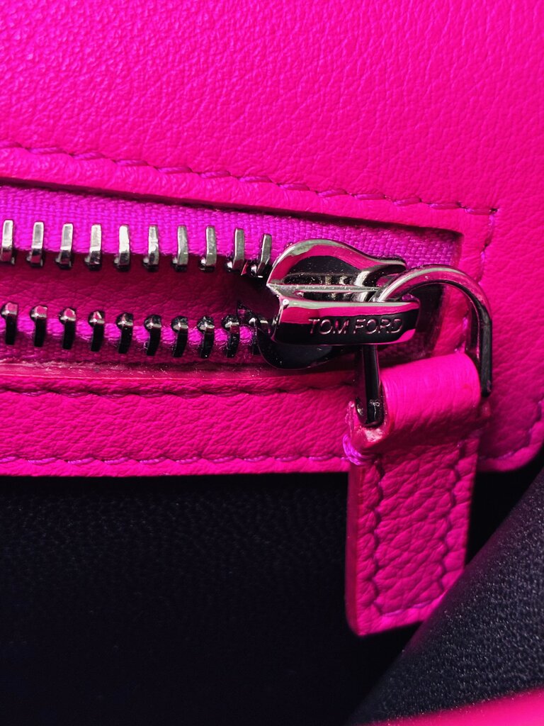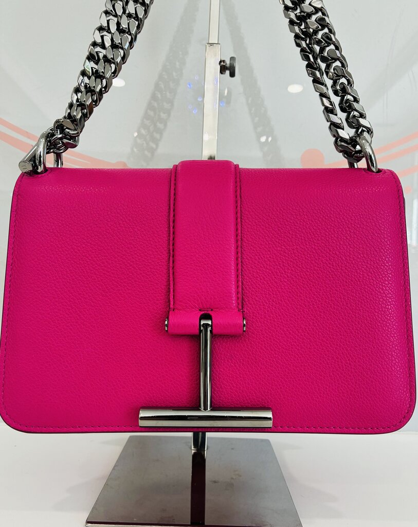 Serve sleek, modern luxury with this Tom Ford Tara Chain Crossbody in fuchsia paired with bold gunmetal silver chain hardware. The structured silhouette and signature T-bar flap closure give it that unmistakable Tom Ford edge, while the chain strap makes it effortless for day or night wear.