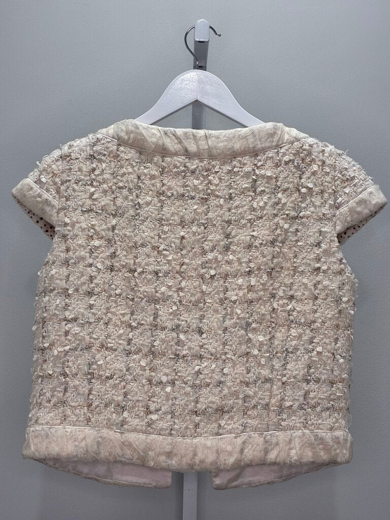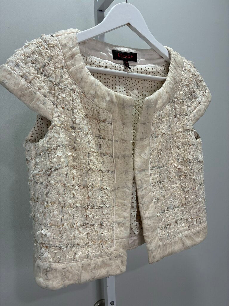 Elevate your wardrobe with this beautifully tailored Escada tweed short-sleeve jacket, a sophisticated piece crafted in a couture-inspired textured bouclé. Rendered in a soft cream colorway with subtle hints of gold and grey-blue, this jacket effortlessly combines classic elegance with modern refinement.